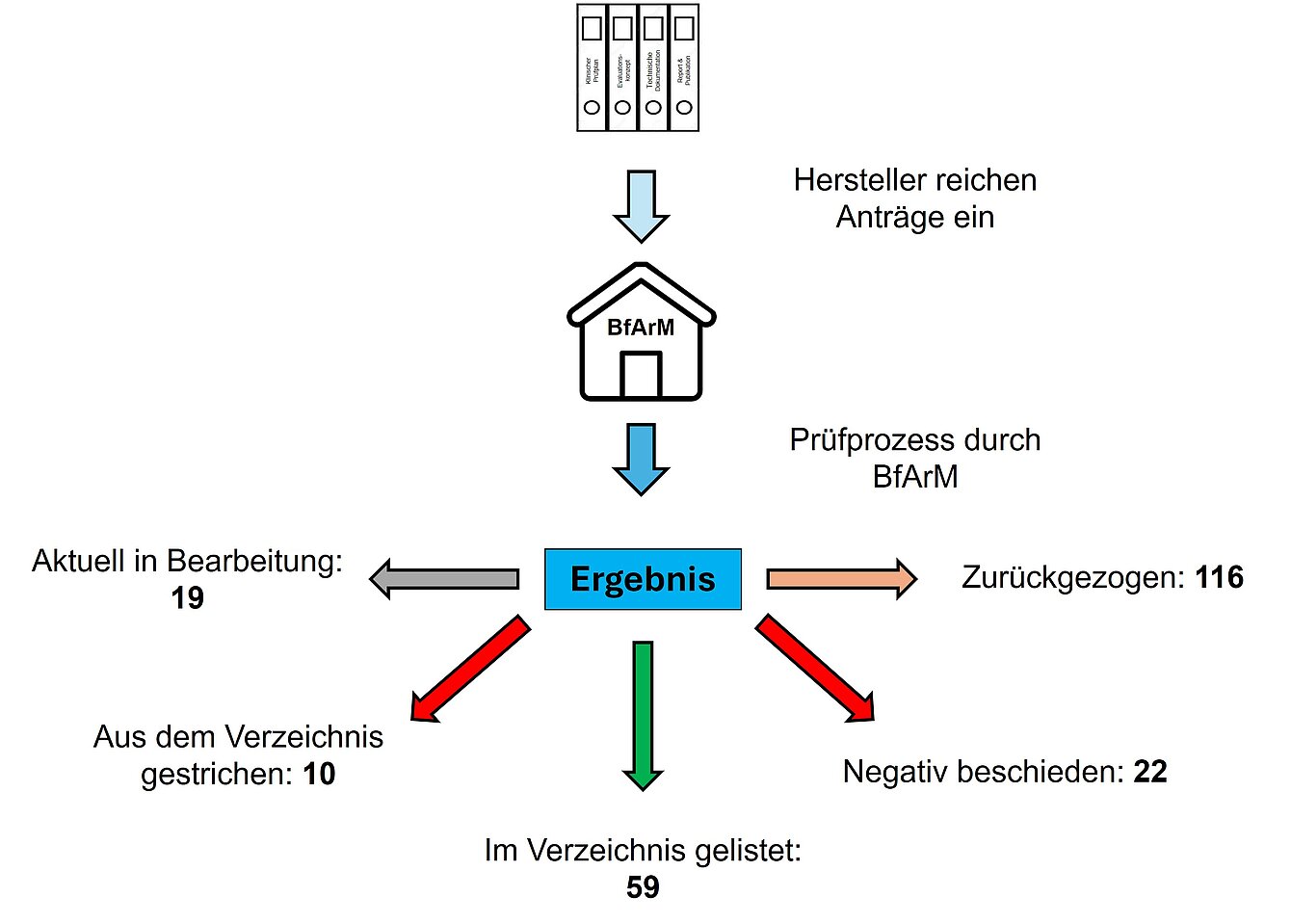 Hierbei ist aber zu erwähnen, dass rückblickend nur ein gewisser Teil der eingereichten Anträge von Erfolg gekrönt war, wobei Hersteller eher ihren Antrag auf Listung zurückgezogen haben, als das der eingereichte Antrag durch das BfArM aktiv negativ beschieden wurde. Dies kann damit im Zusammenhang stehen, dass nach einem negativen Bescheiden eine Sperrfrist von 12 Monaten eintritt, bis ein erneuter Antrag auf Aufnahme eingereicht werden kann [3].